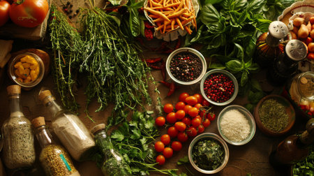 A beautiful arrangement of ingredients ready to be cooked: herbs, spices, and fresh produce