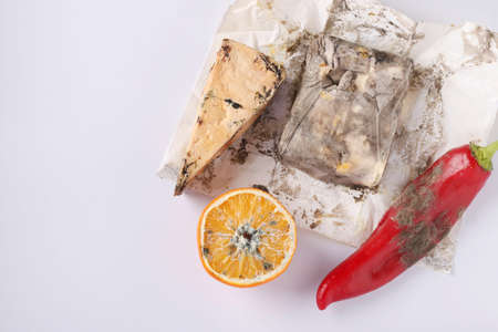 Spoiled rotten foods with mold: orange, pepper, hard cheese and butter on white background, Top view, Copy space