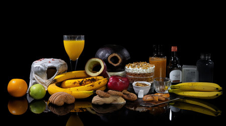 Healthy food with fruits, nuts and juice on black background.