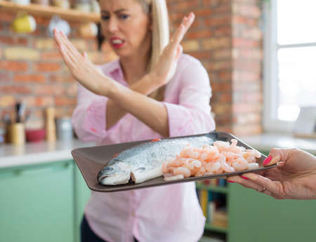 Woman refusing to eat fish and sea food because of her allergy