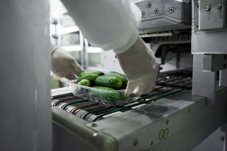 Skilled employee in uniform packing fresh cucumbers