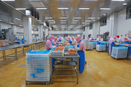 Muslim woman workers working in a chicken meat plant.