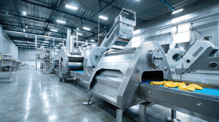 Stainless steel food processing machinery in clean factory environment with conveyor system