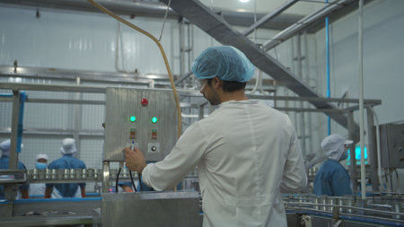 Generative AI : Man worker operator inspecting milk bottles production line dairy factory industry automatic conveyor for transporting