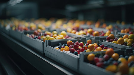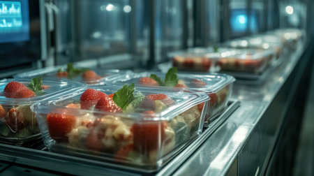 A visually captivating image of fresh strawberries arranged in clear plastic containers on a food processing line, highlighting the modern techniques and efficiency in fruit packaging.