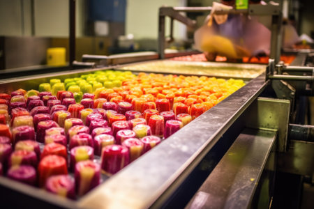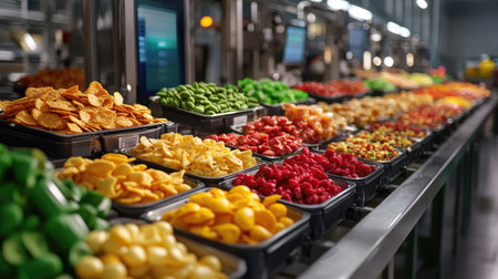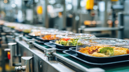 This image captures a conveyor belt loaded with packaged food containers, highlighting the modern food processing industry and its commitment to efficiency and quality.
