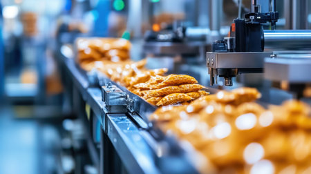 A vibrant food production line featuring automated machinery and a conveyor belt, showcasing the efficient packaging of snacks in an industrial environment.