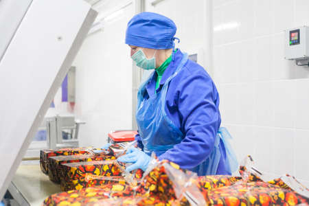 Minsk Belarus - February 2 2021: confectionery factory. A woman sorts marmalade on a conveyor belt