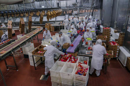 Muslim woman workers working in a chicken meat plant.