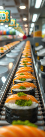 Salmon sushi travels along a conveyor belt at a restaurant