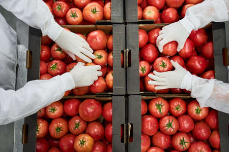 Factory workers packing tomatoes operating fresh red vegetables manufacturing. Professional horticultural manufacture specialists sorting organic natural food. Agronomical company workplace concept