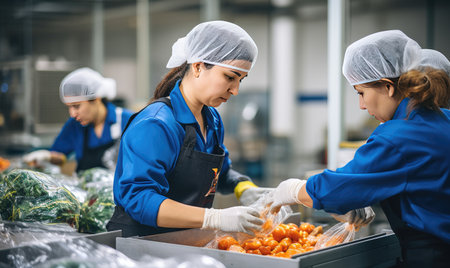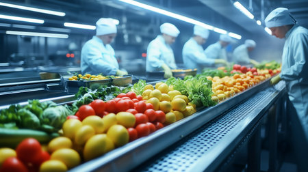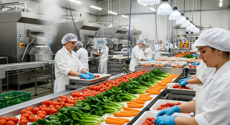Workers in a modern food processing plant are busy on a production line, sorting and packing fresh vegetables. Dressed in sterile white uniforms, hairnets, and gloves, they handle fresh tomatoes, spinach, and carrots, ensuring quality control and hygiene.