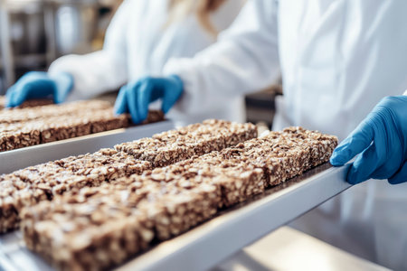 Close-up of workers in protective gloves handling freshly made granola bars on a production line in a food factory
