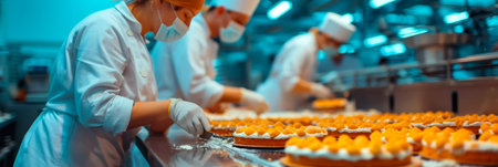 Confectioners who glaze and decorate cakes in a factory. Generative AI