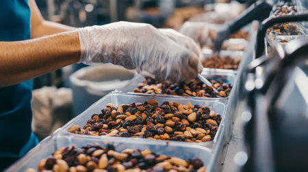 Food production line utilizing AI technology for efficient packaging of mixed nuts
