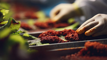 A detailed close-up image of a hand wearing a glove, carefully arranging vibrant red chili flakes on fresh green leaves, highlighting culinary artistry and preparation.