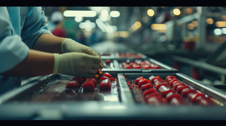 An industrial production scene in a food processing facility, where fresh bell peppers are sorted by automation systems and human workers on a conveyor belt. This visual showcases the efficiency, use of technology, and quality control processes in the modern agriculture and food industry. An ideal photograph for topics like the supply chain, food manufacturing, and industrial automation.