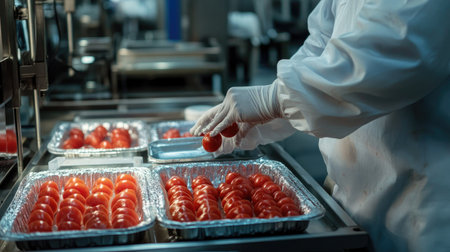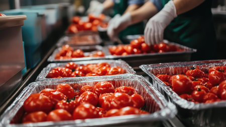 Fresh red tomatoes neatly packed in plastic trays on a conveyor belt in a food processing facility, workers wearing gloves in the background