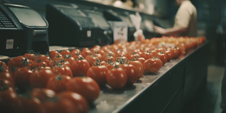 Tomatoes on conveyor belt in supermarket, shallow depth of field