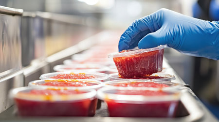 A careful hand in a blue glove places jelly into a clear plastic container on a production line, showcasing the meticulous process involved in dessert preparation in a commercial kitchen.
