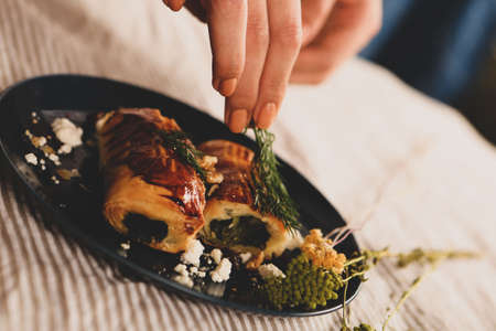 Decoration of paste appetizer on black tray in restaurant. Unrecognizable chef in process of decoration small canape and paste in white bowl