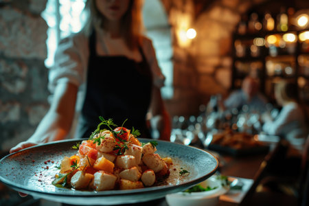 A chef delicately places garnishes on a plate, featuring a beautifully presented dish. The composition highlights vibrant colors from the food, set against a blurred restaurant interior. The lighting emphasizes detail, suggesting culinary expertise, suitable for editorial and commercial use, such as food industry content.