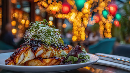 A close-up of a finely plated dish in a luxurious dining setting. The backdrop of warm bokeh lights creates a perfect blend of elegance and comfort.