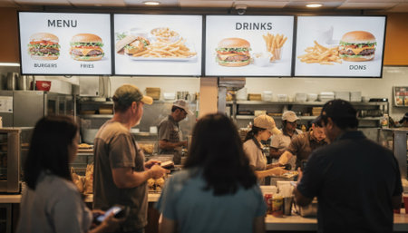 Lunch rush scene at fast food counter with sharp focus on illuminated menu displays and outoffocus customers and busy staff behind counter.