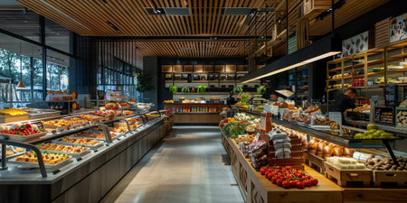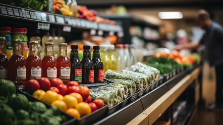 Abundance of food and wine bottles in a modern retail store generated by artificial intelligence