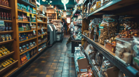 A warm and inviting grocery store aisle filled with various packaged foods, jars, and cans, creating a cozy shopping environment.