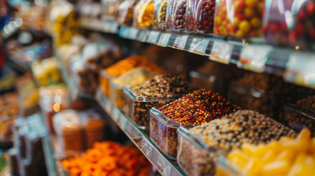 Spices and dried foods in containers on shelves in a grocery store, showcasing a variety of textures and colors in a vibrant market setting.