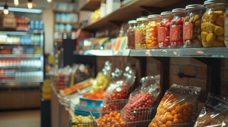 A store display with colorful candy jars lined up on shelves, capturing the vibrant and cheerful atmosphere of a sweet shop.