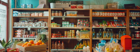 A cozy interior of a small grocery store with a variety of products neatly arranged on shelves. The atmosphere is warm and inviting, offering a local shopping experience with fresh produce and essentials.