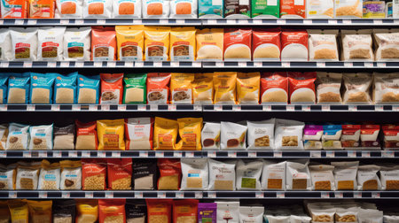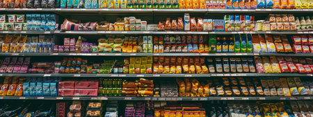 A variety of grocery items displayed on supermarket shelves, including snacks and food products. The neatly arranged packages offer customers a wide range of options, creating an organized and colorful aisle.