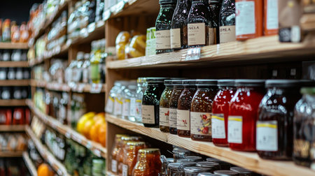 A well-organized shelf in a rustic store, displaying glass jars filled with various preserves, creating a cozy and artisanal atmosphere.