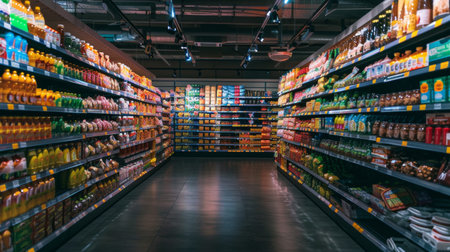 A wide aisle in a grocery store, showing fully stocked shelves with various food and household products under bright lighting. Ideal for themes of shopping, consumerism, and retail.