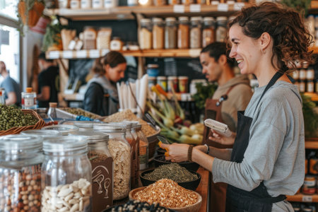 Customers buying dry goods and bulk products in plastic-free grocery stores. Conscious shopping, sustainable small businesses, minimalist lifestyle