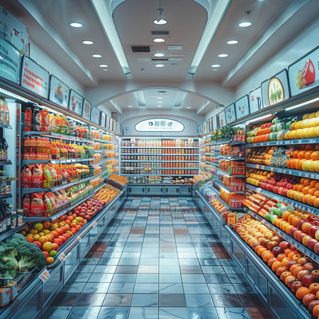A wide angle shot depicts a well-lit grocery store interior. Shelves overflow with vibrant fresh produce. The scene showcases an aisle with symmetrical rows and overhead lighting. The composition suggests potential use for commercial content related to food, retail, or health.
