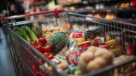 Shopping cart with diverse fresh groceries in supermarket aisle.