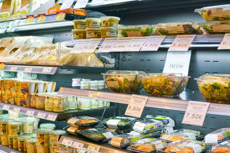 MILAN, ITALY - CIRCA NOVEMBER, 2017: assortment of food on display for sale at Carrefour Express in Milan.