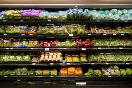 A well-organized supermarket aisle featuring neatly arranged fresh produce, packaged goods, and colorful products under bright lighting.