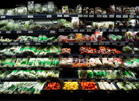 BANGKOK, THAILAND - NOVEMBER 30 : fresh organic vegetables and fruits for sale on stand or shelf in Tops Supermarket on November 30, 2016 in BANGKOK, Thailand.