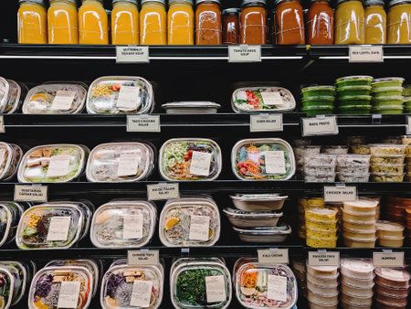 Shelves with different salads in the organic grocery store, healthy food choice