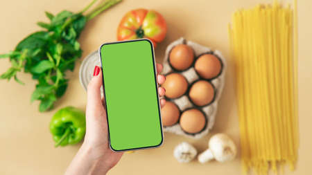 Female hand uses the Mobile Phone to take photo with the Thai food to recommend and share to social media.