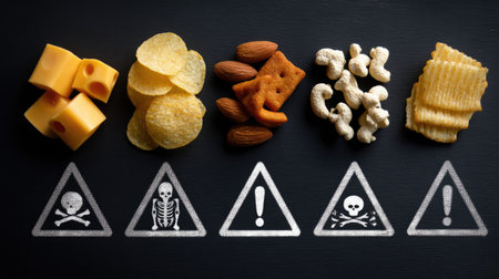 A creative display featuring various snack foods alongside warning signs including skull and skeleton icons, emphasizing caution in dietary choices.