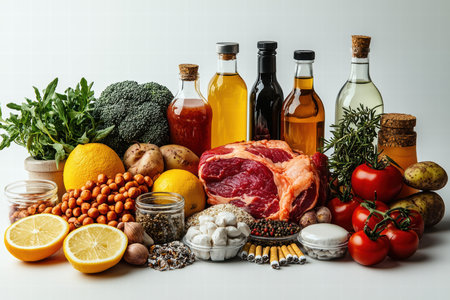 Fresh raw ingredients including beef steak, tuna, bell pepper, spinach, lime, and various spices, arranged for a healthy and balanced diet preparation.