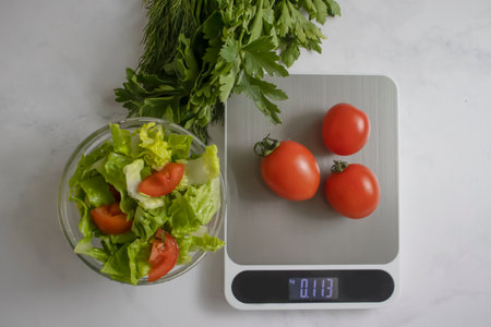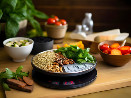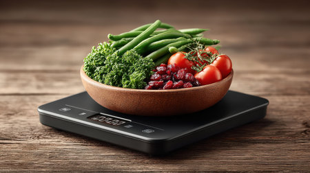 A vibrant arrangement of fresh vegetables and herbs on a digital kitchen scale, emphasizing healthy cooking choices and nutrition. Perfect for meal planning.