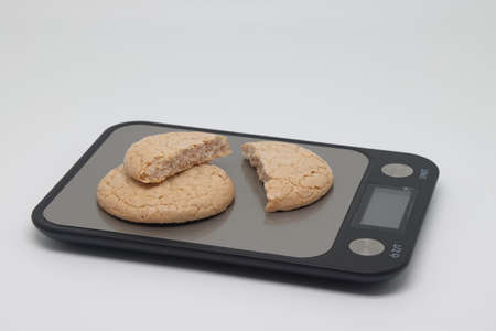 Nut cookies on electronic kitchen scales, accurate calorie counting, proper nutrition