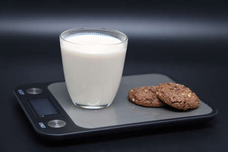 Glass cup with homemade cookies on a kitchen scale. Diet and calorie counting. dark background