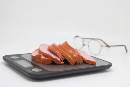 Sliced boiled delicious sausage on electronic scales, calorie counting, proper nutrition